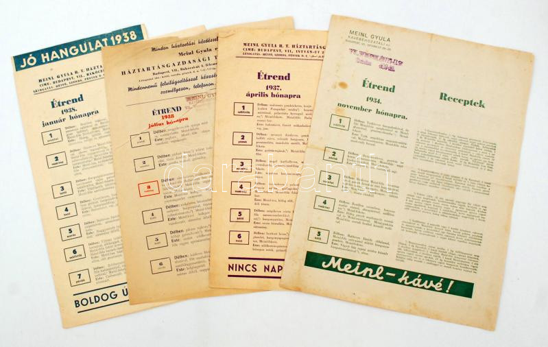 Beschreibung: 1934-1938 A Meinl Gyula R.T. Háztartásgazdasági Tanácsadójának 4 db étrendje receptekkel