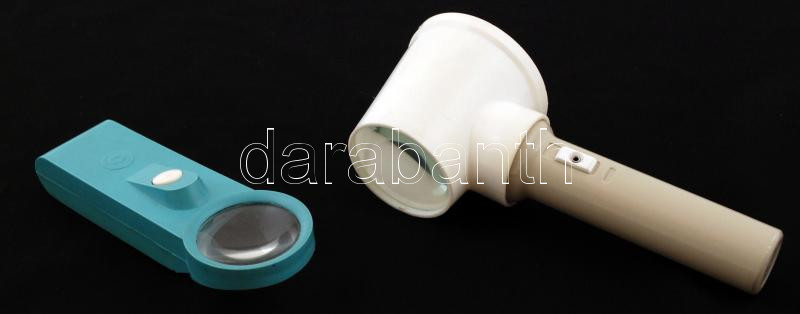 Beschreibung: 2 db elemes nagyító, egyik működik, a másik elem nélkül, h: 13 cm, 16,5 cm