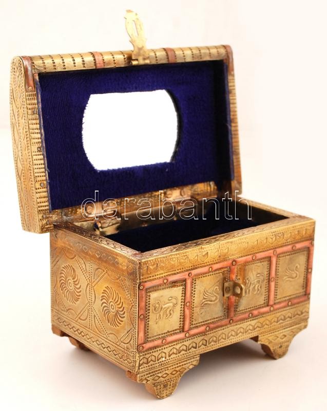 Beschreibung: Réz lemezes fa piperés doboz, plüss belsővel, tükörrel, 11×17 cm