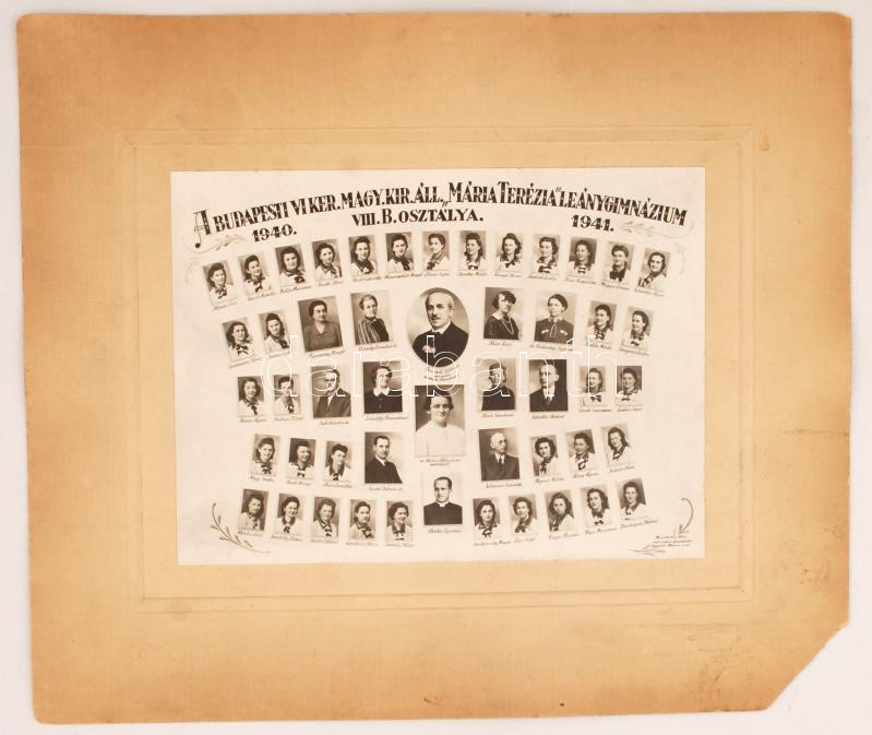 1941 A Budapesti VI. ker. Magy. Kir. Áll., "Mária Terézia" Leénygimnázium VIII. B. osztályának tablóképe kartonra kasírozva, karton sarok hiányzik, 16x21cm