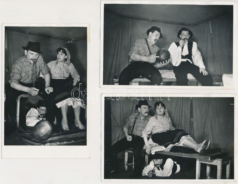 1959. december 31. Tiszavölgyi József (1909-?) pecséttel jelzett vintage fotói egy műkedvelő társulat szilveszteri fellépéséről a BESZKART-nál, 5 db fotó, 9x14 cm