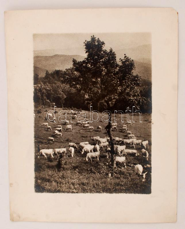 Beschreibung: Legelésző marhacsorda, művészfólián keresztül készített fotó, egyik sarkán kis hiánnyal, 22x17 cm