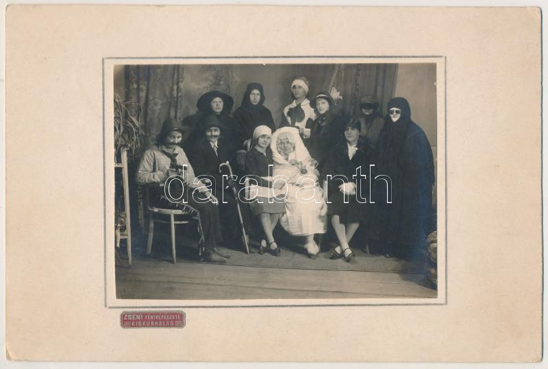 Beschreibung: cca 1925 Kiskunhalasi műkedvelő színtársulat csoportképe Zseni fényképészeti műtermében, 11x15 cm, karton 16x25 cm