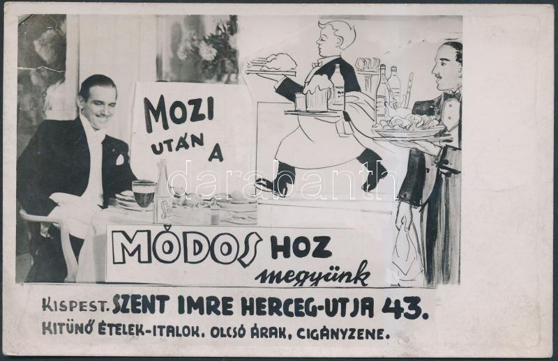 Beschreibung: cca 1940 Fekete György budapesti fényképész reklám fotólapja a kispesti Módos vendéglőről, pecséttel jelzett, 9x14 cm