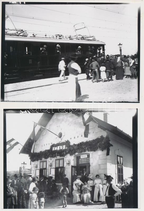 Beschreibung: cca 1940 Szada, fontos vendéget várnak a szadai vasútállomáson, 5 db korabeli üveglemez negatívról készült mai modern nagyítások, 13x18 cm