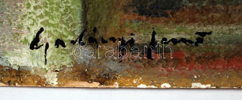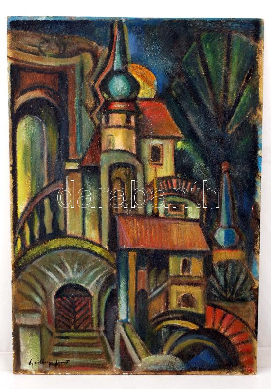 Beschreibung: Gadányi jelzéssel: Kisváros. Olaj, farost, 65×45 cm