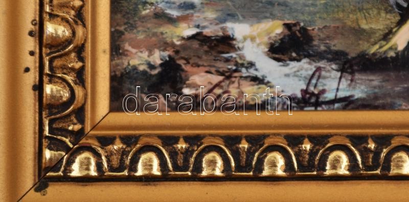 Beschreibung: Komjáti Géza (1956- ): Magányos hölgy, olaj, farost, díszes, aranyozott fa keretben, 13×10,5 cm
