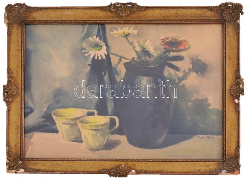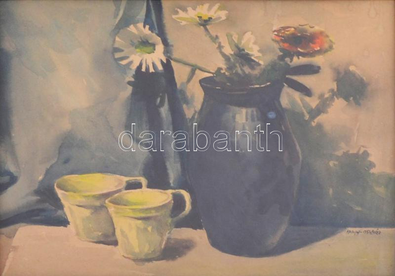 Beschreibung: Nagy jelzéssel: Virágcsendélet. Akvarell, papír, üvegezett keretben, 29×39 cm
