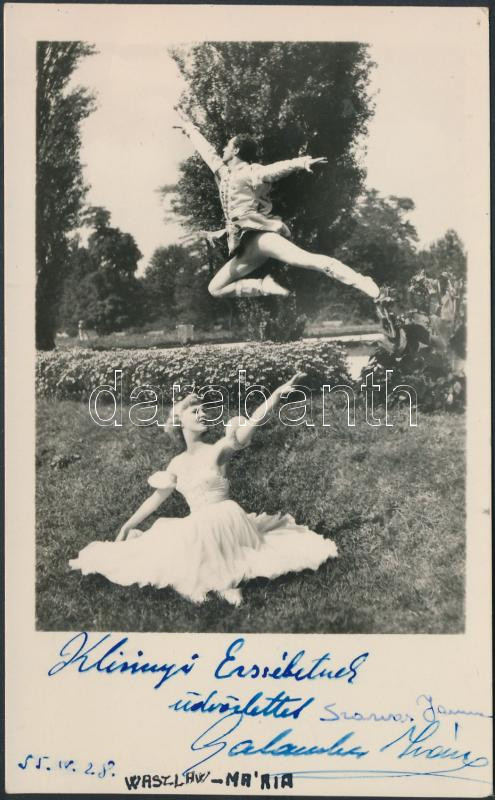 Beschreibung: Szarvas Janina(1935-) és Galambos Iván balettművészek aláírása az őket ábrázoló fotólapon