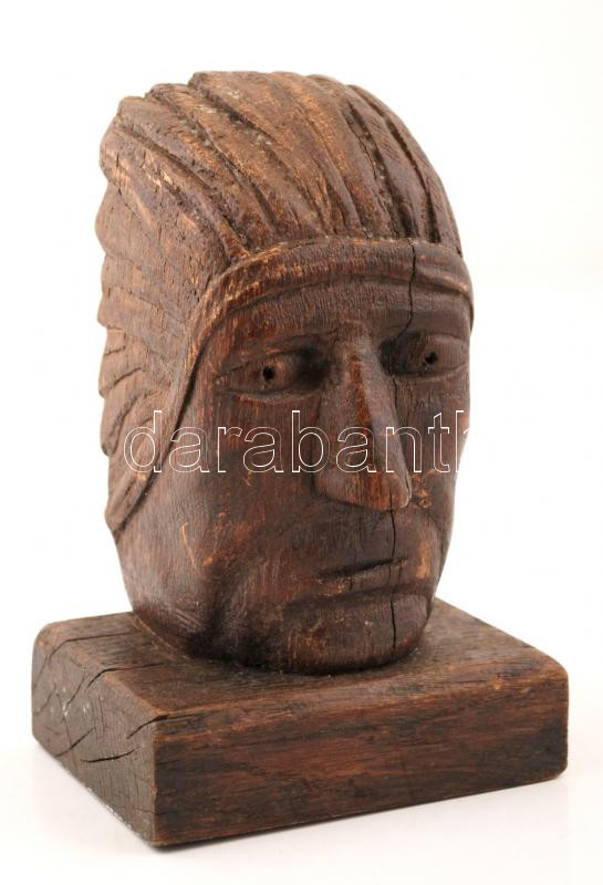 Indiánfej, fából készült asztali szobor, jelzés nélkül, m: 18 cm https://www.darabanth.com/de/251-Fernauktion/251.0/Andere-Sammelgebiete/Skulpturen-Statuetten-Plaketten~600007/Indianfej-fabol-keszult-asztali-szobor-jelzes-nelkul-m-18-cm~II1212864