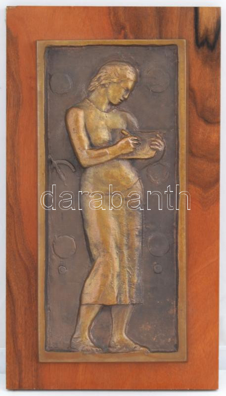 Beschreibung: Martsa István (1912-1978): Író nő, bronz falikép, fa, jelzés nélkül, 38×21 cm