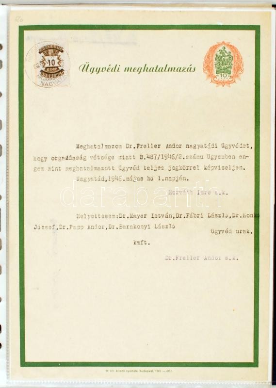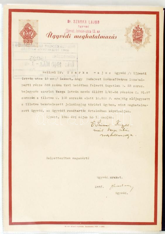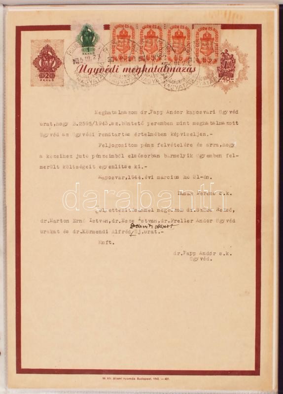 1937-1944 Ügyvédi meghatalmazások gyűjteménye. Összesen 30 db meghatal... https://www.darabanth.com/de/251-Fernauktion/251.0/Andere-Sammelgebiete/Stempelmarken~600023/1937-1944-Ugyvedi-meghatalmazasok-gyujtemenye-Osszesen-30-db-meghatalmazas-valogatott-okmC3~II1214611