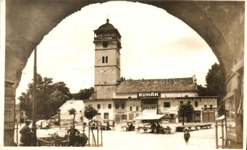 Beschreibung: Rozsnyó, Roznava; Rákóczi őrtorony, piac, Varjú virágkereskedés, Baffv N. üzlete, Puskás üzlete / watchtower, market, shops, photo