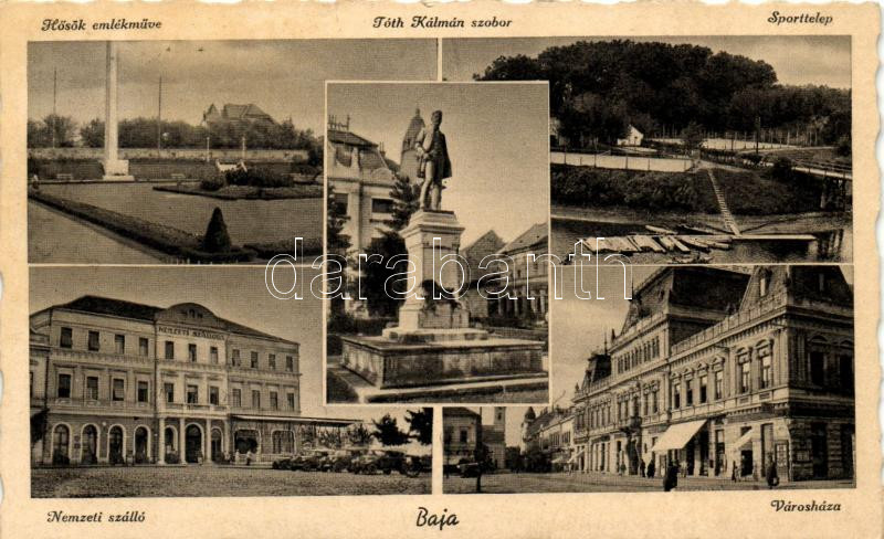 Baja, Hősök emlékműve, Tóth Kálmán szobor, Sporttelep, Nemzeti szálló,... https://www.darabanth.com/de/251-Fernauktion/251.0/Ansichtskarten/Ungarn~400005/Baja-Hosok-emlekmuve-Toth-Kalman-szobor-Sporttelep-Nemzeti-szallo-varoshaza~II145553