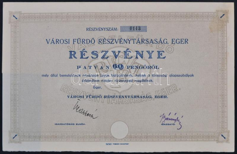 Beschreibung: ~1930. "Városi Fürdő Részvénytársaság, Eger" részvénye 60P-ről szelvényekkel T:I-