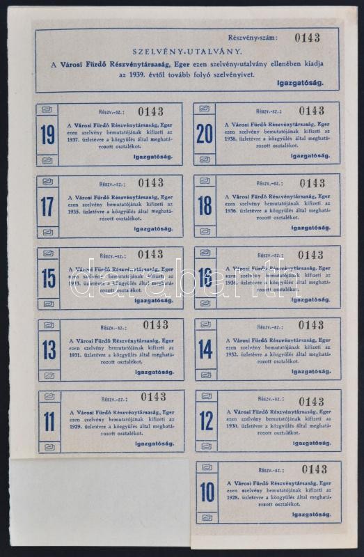 ~1930. "Városi Fürdő Részvénytársaság, Eger" részvénye 60P-r... https://www.darabanth.com/de/251-Fernauktion/251.0/Numismatik/Aktien-und-Tickets~5/7E1930-Varosi-Furdo-Reszvenytarsasag-Eger-reszvenye-60P-rol-szelvenyekkel-TI-~II1208963