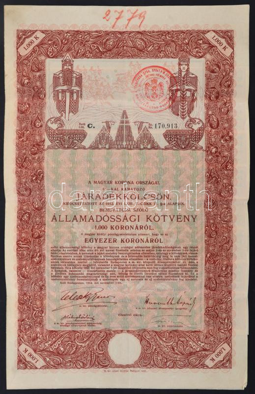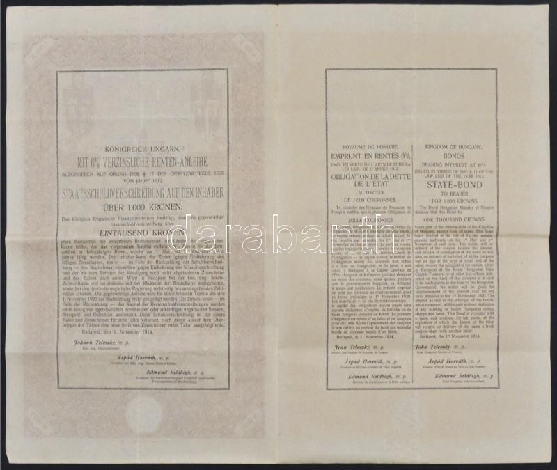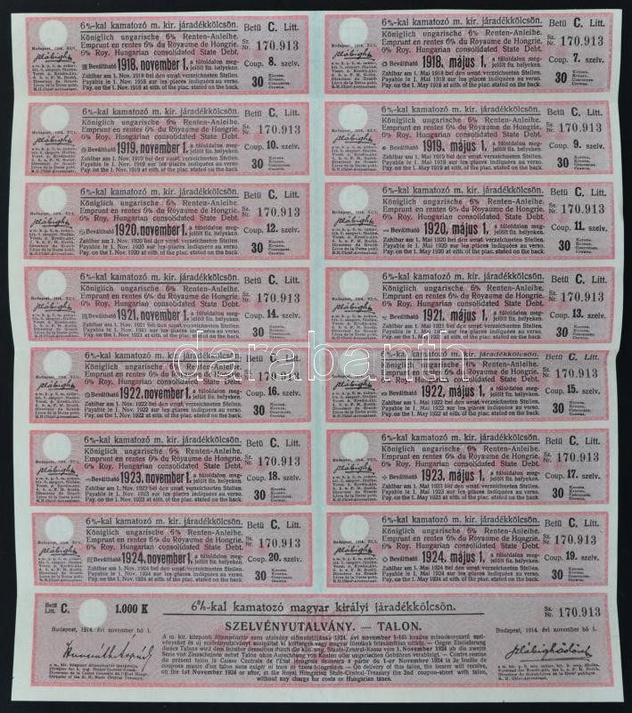 Budapest 1914. "A Magyar Korona Országai 6%-kal kamatozó járadékk... https://www.darabanth.com/de/251-Fernauktion/251.0/Numismatik/Aktien-und-Tickets~5/Budapest-1914-A-Magyar-Korona-Orszagai-625-kal-kamatozo-jaradekkolcson-1000K-rol-szelveny~II1211293