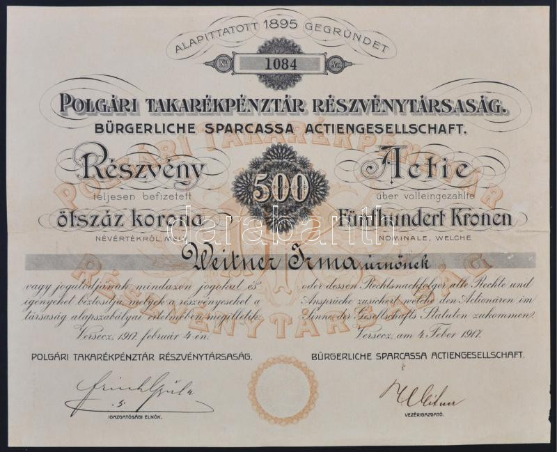 Beschreibung: Versecz 1917. "Polgári Takarékpénztár Részvénytársaság" részvénye 500K-ról T:III
