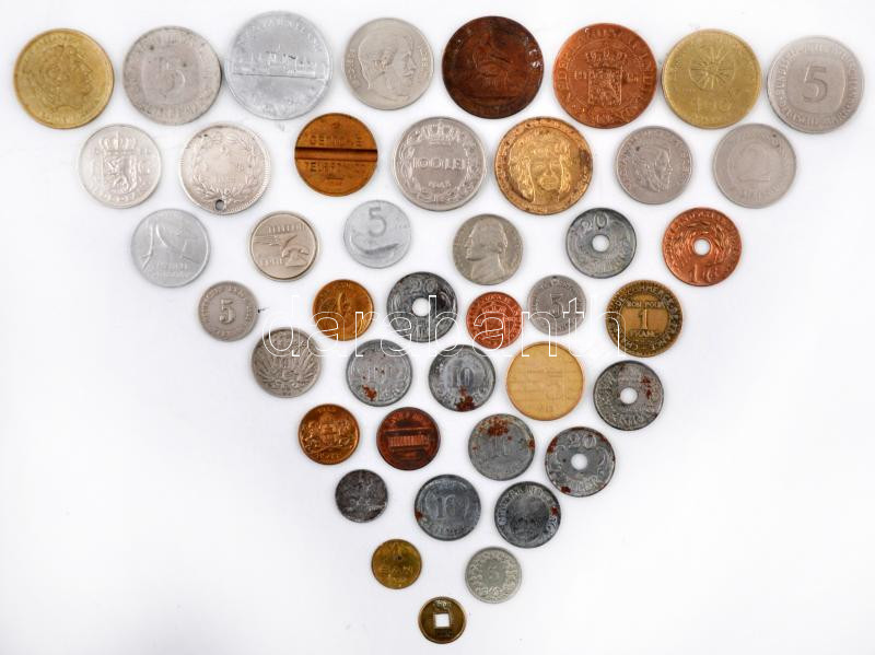 43db-os vegyes magyar és külföldi zseton és érme tétel, közte egy Ag, Franciaország 1832H 2Fr Ag "I. Lajos Fülöp" lyukasztott T:vegyes