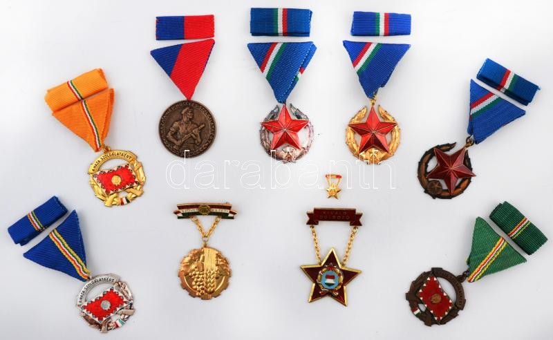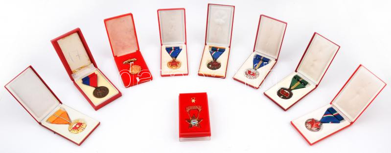 9db főleg katonai és belügyi kitüntetés, közte 1951. "Közbiztonsági Érem" arany, ezüst és bronz fokozatai a rendőrség részére, mindhárom mellszalaggal, szalagsávval tokban, mind a 9db kitüntetés tokban, de nem mind saját tok T:2,2-