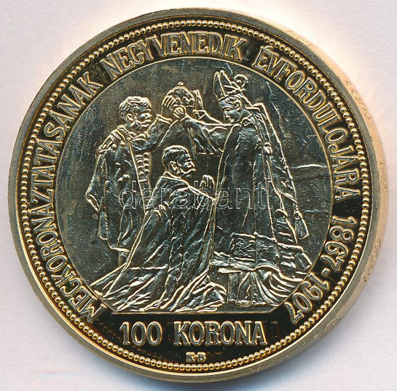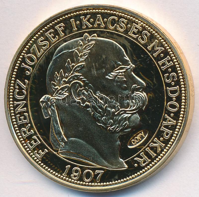 Beschreibung: DN "Osztrák-Magyar Monarchia pénzei utánveretben - 1907. 100K" aranyozott Cu-Ni emlékérem "COPY" beütéssel, tanúsítvánnyal (38mm) T:PP