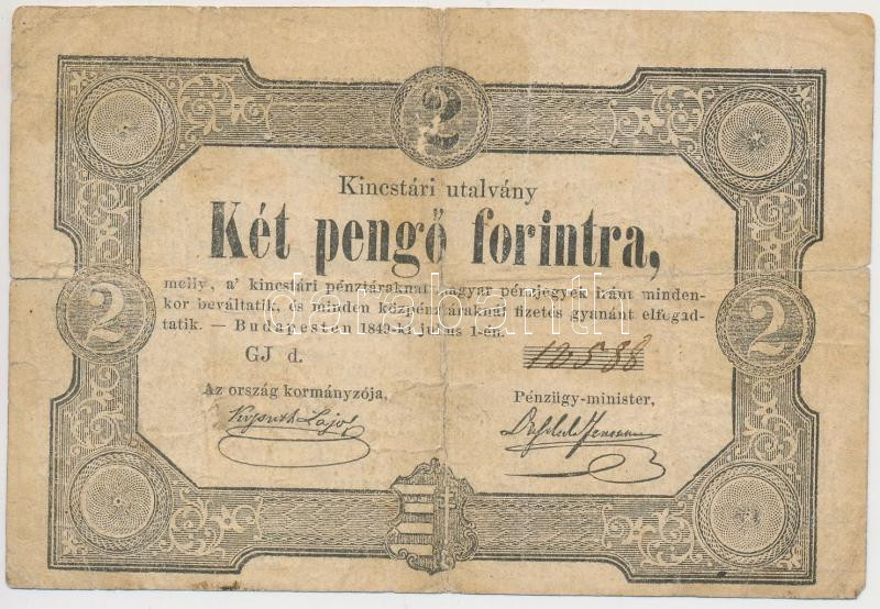 1849. 2Ft "Kincstári utalvány" T:III- https://www.darabanth.com/de/251-Fernauktion/251.0/Numismatik/Ungarische-Banknoten~7/1849-2Ft-Kincstari-utalvany-TIII-~II1211342