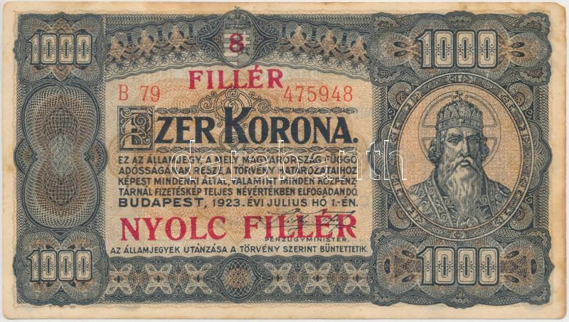 1923. 1000K "8 FILLÉR - NYOLC FILLÉR" felülnyomással T:III hajtatlan, ... https://www.darabanth.com/de/251-Fernauktion/251.0/Numismatik/Ungarische-Banknoten~7/1923-1000K-8-FILLER--NYOLC-FILLER-felulnyomassal-TIII-hajtatlan-kisebb-hajlasok-folt-sa~II1209999