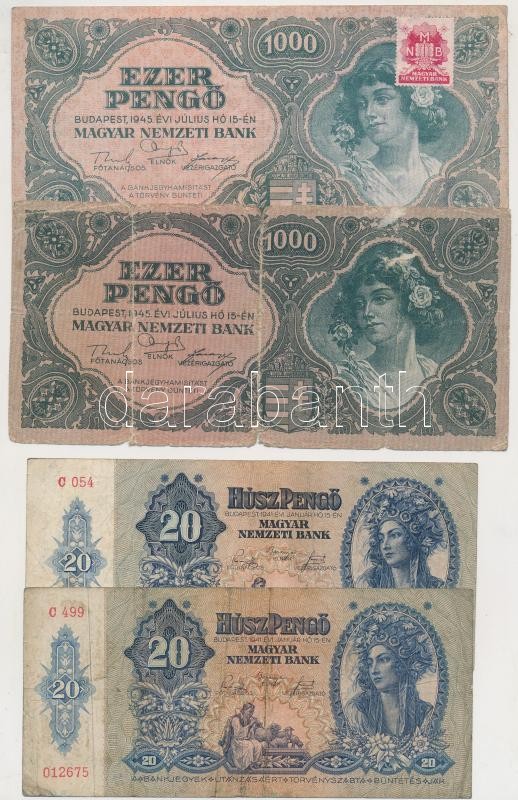 Beschreibung: 1936. 10P (6x) + 1941. 20P (6x) + 1945. 500P (4x) közte 1db magyar "N" betűvel + 1000P (2x) egyik piros "MNB" bélyeggel T:III,III-