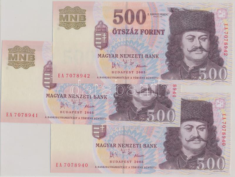 2005. 500Ft "EA" (3x) sorszámkövetők T:I https://www.darabanth.com/de/251-Fernauktion/251.0/Numismatik/Ungarische-Banknoten~7/2005-500Ft-EA-3x-sorszamkovetok-TI~II1212199