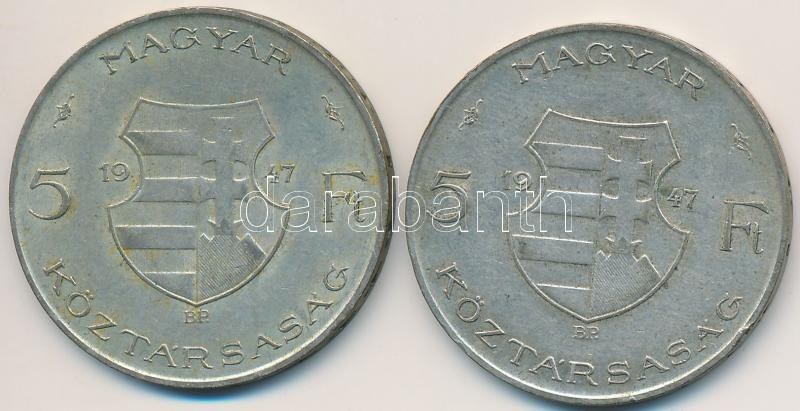 1947. 5Ft Ag "Kossuth" (2x) T:2-,3 https://www.darabanth.com/de/251-Fernauktion/251.0/Numismatik/Ungarische-Munzen~8/1947-5Ft-Ag-Kossuth-2x-T2-3~II1213133
