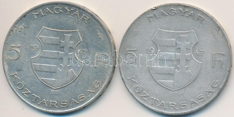 1947. 5Ft Ag "Kossuth" (2x) T:2-,3 https://www.darabanth.com/de/251-Fernauktion/251.0/Numismatik/Ungarische-Munzen~8/1947-5Ft-Ag-Kossuth-2x-T2-3~II1213139
