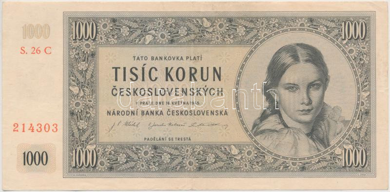 Czechoslovakia 1945. 1000 Korun C:F https://www.darabanth.com/de/251-Fernauktion/251.0/Numismatik/Weltweit-Banknoten~11/Csehszlovakia-1945-1000K-TIII--Czechoslovakia-1945-1000-Korun-CF~II1209969