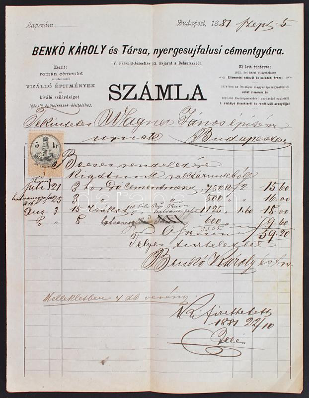 1887 Benkó Károly és Társa, nyergesujfalusi cémentgyára, számla okmány... https://www.darabanth.com/de/252-Fernauktion/252.0/Andere-Sammelgebiete/Dokument~800029/1887-Benko-Karoly-es-Tarsa-nyergesujfalusi-cementgyara-szamla-okmanybelyeggel-5kr-28x~II1221974