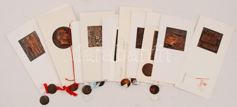 cca 1960-1980 Különféle fém lemezplakettes üdvözlőlapok és meghívók (1. sz. Autóközlekedési Vállalat, Fővárosi Óra- és Ékszeripari Vállalat, Kőbányai Könnyűfémmű, stb.), különböző méretben, jó állapotban, egy részük aláírásokkal