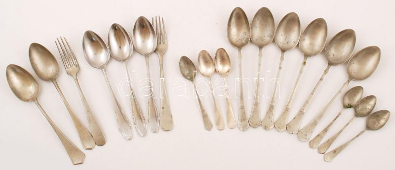 Beschreibung: Alpakka evőeszközök, leveses kanalak, villák, kávéskanalak, összesen 19 db