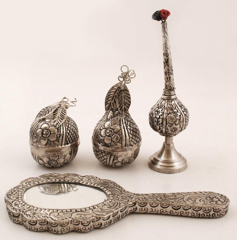 Beschreibung: Díszes asztali fémtárgyak; tükör, ékszertartók, stb. 4db, kis hibákkal