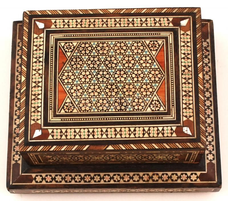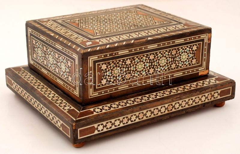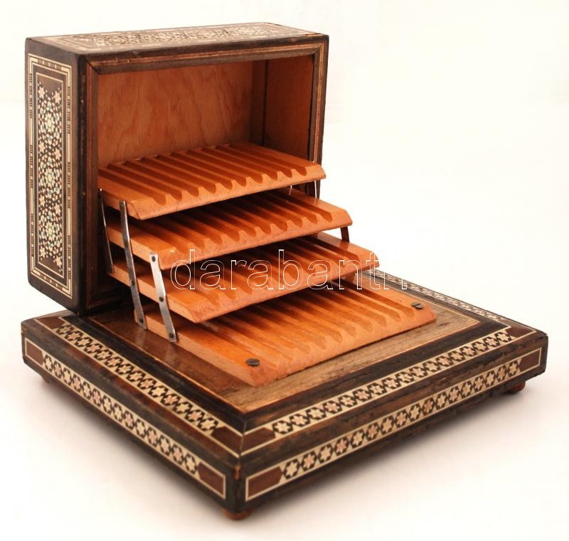 Beschreibung: Gazdagon díszített, gyöngyház berakásos, zenélő cigarettatartó fa doboz, kis sérüléssel, 22,5×19×10,5 cm