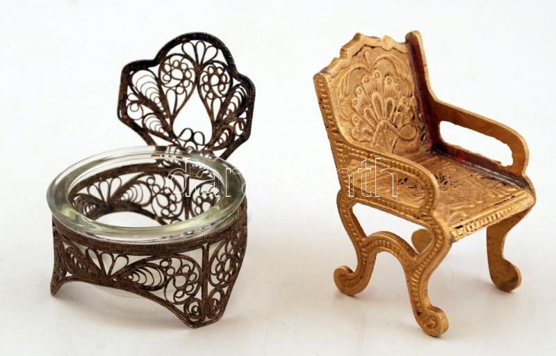 Beschreibung: Széket formázó ezüstözött filigrán fűszertartó, üveggel + széket formázó díszes réz fűszertartó, üveg nélkül; különböző méretben
