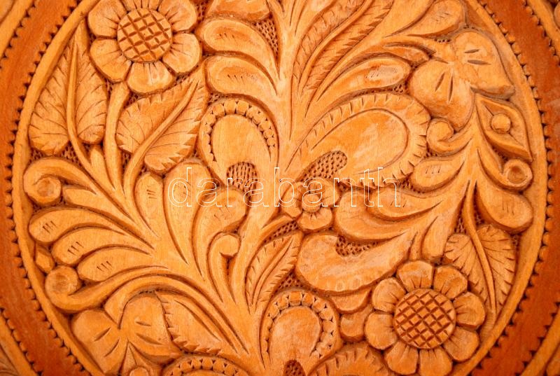 Beschreibung: Tűzzománc páva fa alapon, faragott fa tányérral, d: 22 cm, 27x22 cm