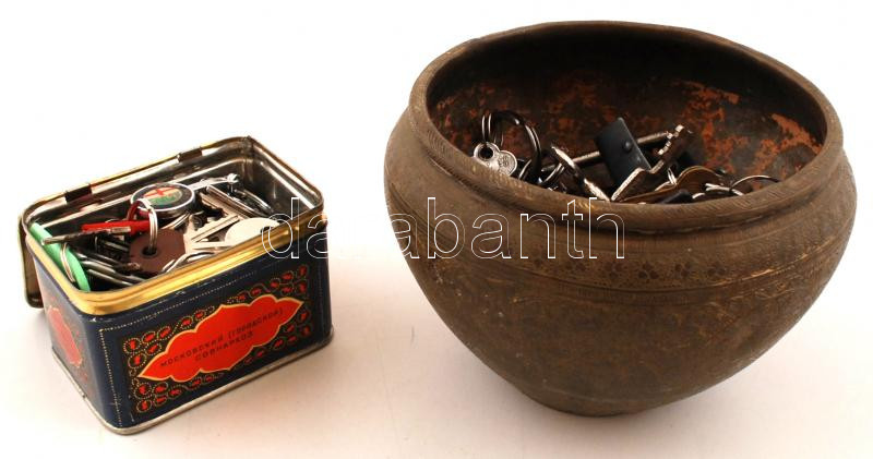 Beschreibung: Vegyes kulcsgyűjtemény, bronz edényben, ill. retró orosz teás dobozban, benne néhány kulcstartóval, különböző méretben