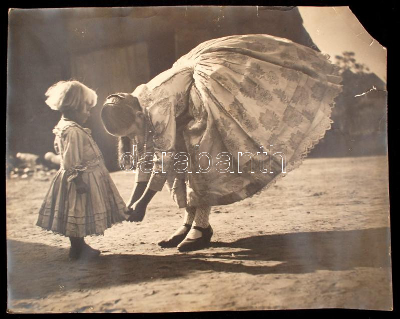 cca 1920-1930 Magyar népviseletben, nagyméretű fotó, gyűrődéssel, jobb oldalt szakadással, jobb felső sarka hiányzik, 40×50 cm / cca 1920-1930 In Hungarian traditional costume, huge photograph, with dog-ear, small tear at its right side, the upper right corner is missing, 40×50 cm