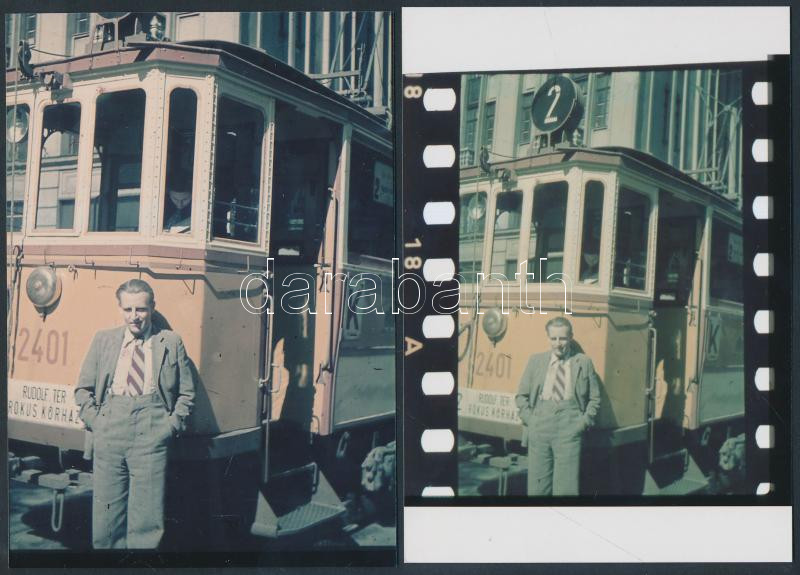 Beschreibung: cca 1942 Budapest, A 2-es villamos előtt készült emlékkép, korabeli színes diapozitív filmről készült mai modern nagyítás, 2 db fénykép, 13x9 cm