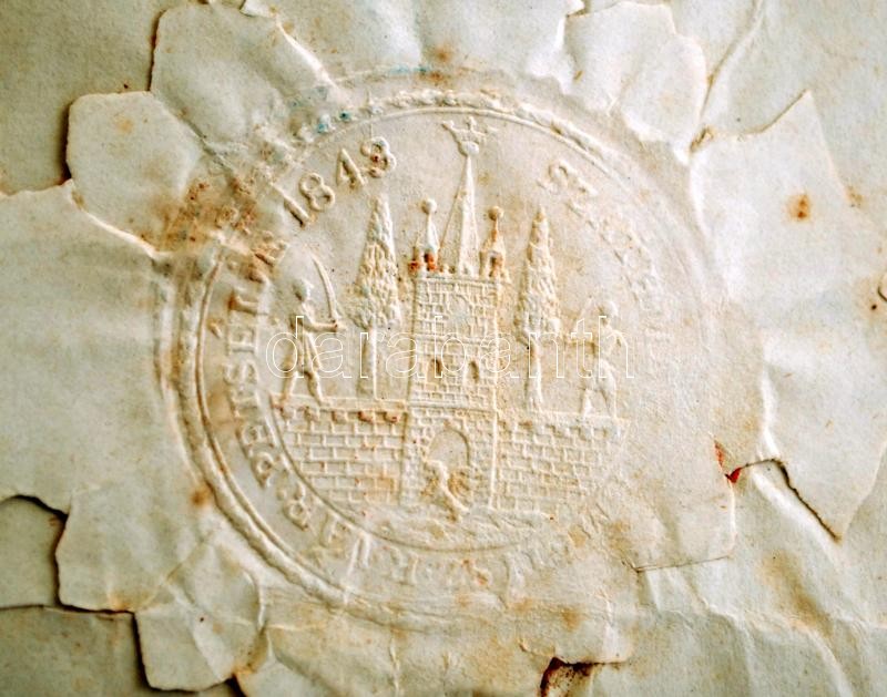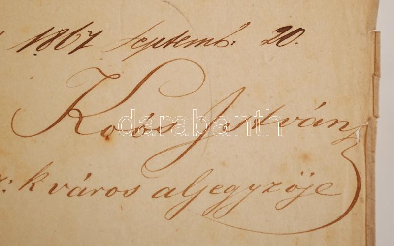 1867 Szatmári aljegyző által kiállított hiteles másolat Damjanich János vezérőrnagy által Baudis József őrnagy, hadtest-segéd részére kiállított alezredesi kinevezésről, felzetes viaszpecséttel, a szélein kis szakadásokkal