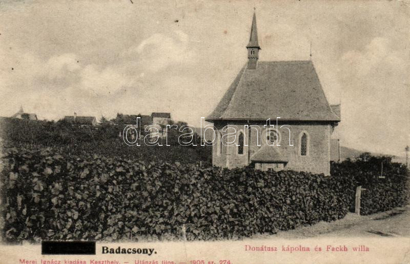 Badacsony, Donátusz kápolna, Fackh villa, kiadja Mérei Ignácz (r) https://www.darabanth.com/de/252-Fernauktion/252.0/Ansichtskarten/Ungarn~200006/Badacsony-Donatusz-kapolna-Fackh-villa-kiadja-Merei-Ignacz-r~II1219940
