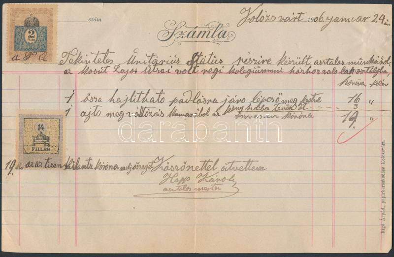 Beschreibung: 1904-1927 3 db régi okmány: jegyzék, számla, házassági anyakönyvi kivonat, mindegyiken okmánybélyegekkel