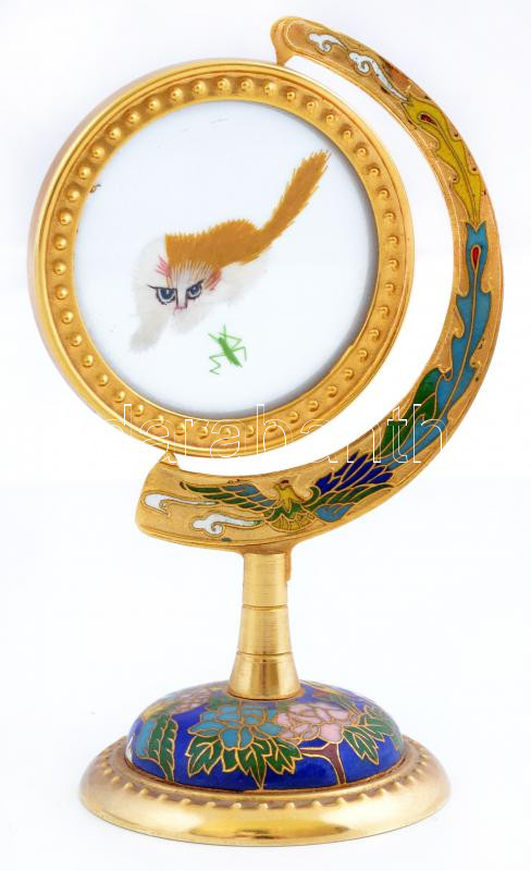 Beschreibung: Cica és a szöcske, forgó textil kép, zománc díszített réz tartóban, m:13 cm