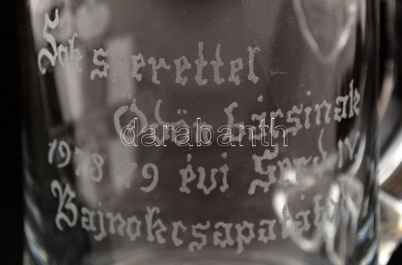 FTC Futball relikviák: FTC sörös korsó ón fedéllel Horváth Ödön labdarúgónak,"Sok szeretettel Ödön bácsinak 1978-79 évi Gerd. IV. bajnok csapatától" felirattal, 14x9cm