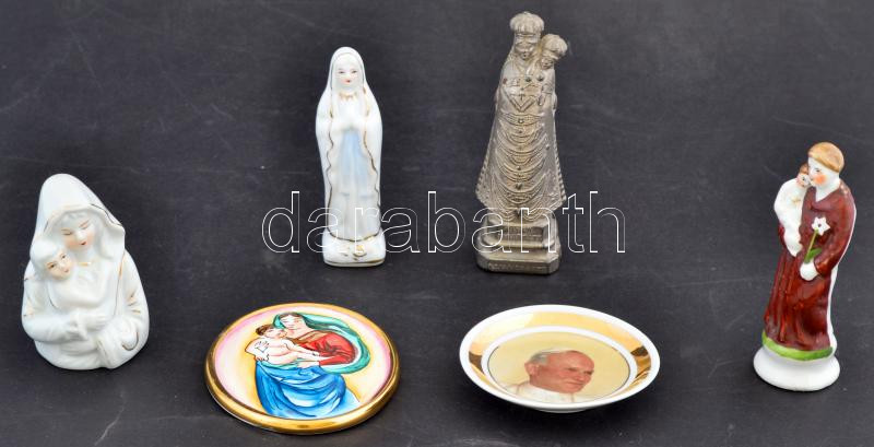 Beschreibung: Vallásos tárgyak: 1 db fém és 5 db porcelán szobrocska, plakett, tálka