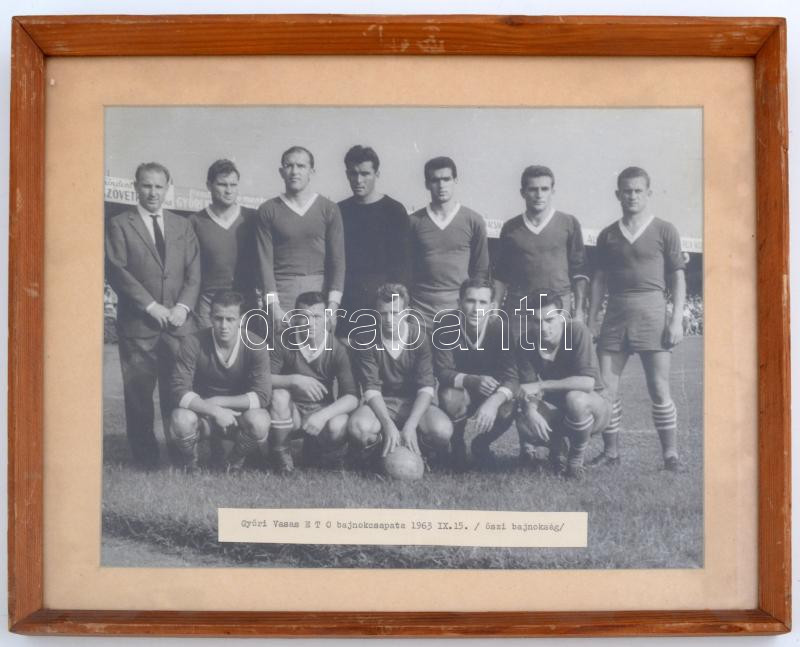 1963 a Győri Vasas ETO bajnokcsapata 1963. IX. 15. (őszi bajnokság)? nagyméretű fotó, alján ill. hátulján feliratozva, paszpartuban, üvegezett fa keretben, 22,5×29,5 cm