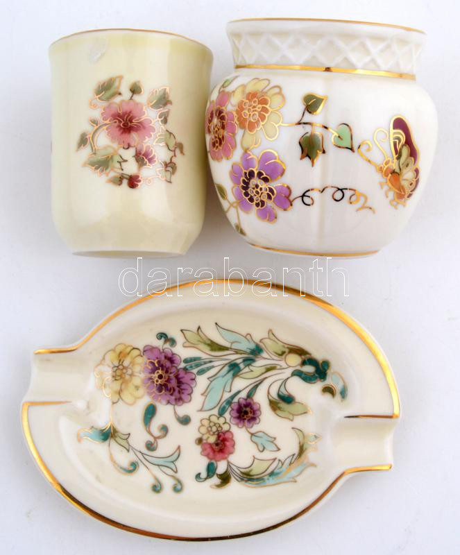 Beschreibung: Zsolnay pillangó és virágmintás kis tárgyak: minikaspó, hamutál, kupica, hibátlanok, jelzettek, 3 db